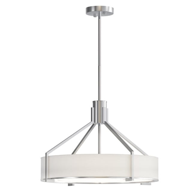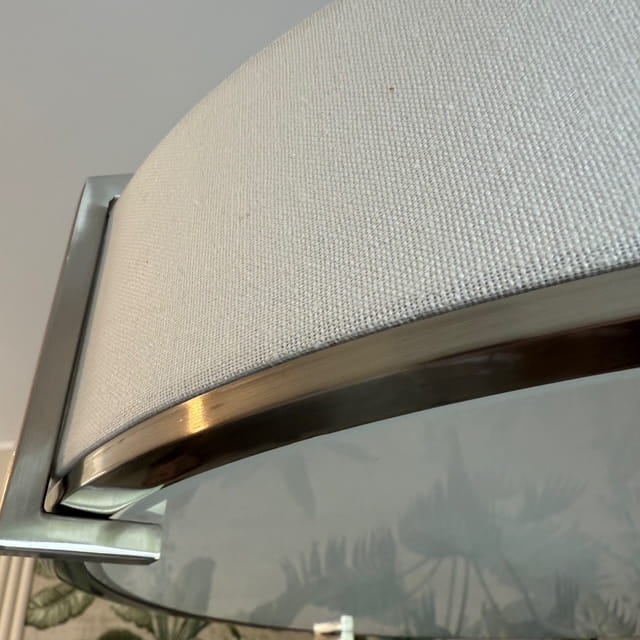 Lampa w stylu nowoczesnym, wykonana z metalu w kolorze satynowy nikiel, abażur bawełniany w kolorze biało lnianym, zamknięty od dołu czekoladowa nowoczesną ramą, która nadaje lampie strzelistości.
