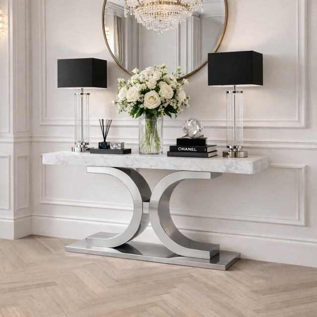 Konsola doskonale odnajdzie się w reprezentacyjnym holu, eleganckim salonie, sypialni czy garderobie, tworząc spójną kompozycję z designerskimi dodatkami, lustrami i oświetleniem.