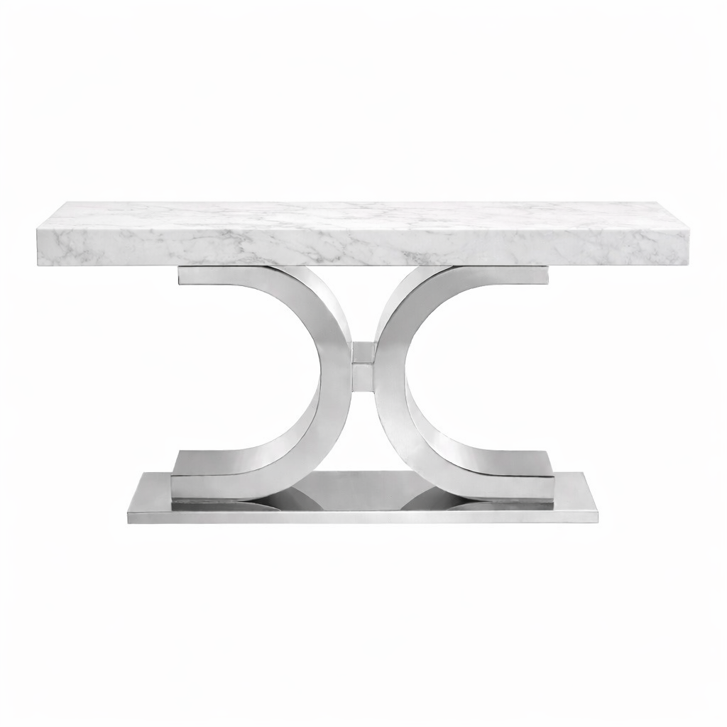 Blat z naturalnego kamienia o unikatowym rysunku żył nadaje konsoli charakteru i ekskluzywności, a dopracowana metalowa podstawa w szlachetnym wykończeniu podkreśla jej nowoczesno-klasyczny styl. To połączenie glamour i modern classic, tak charakterystyczne dla luksusowych wnętrz światowej klasy.