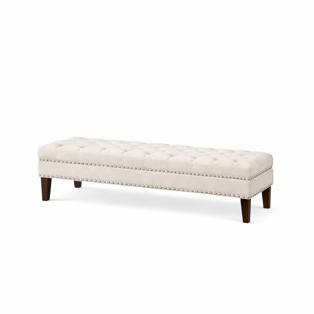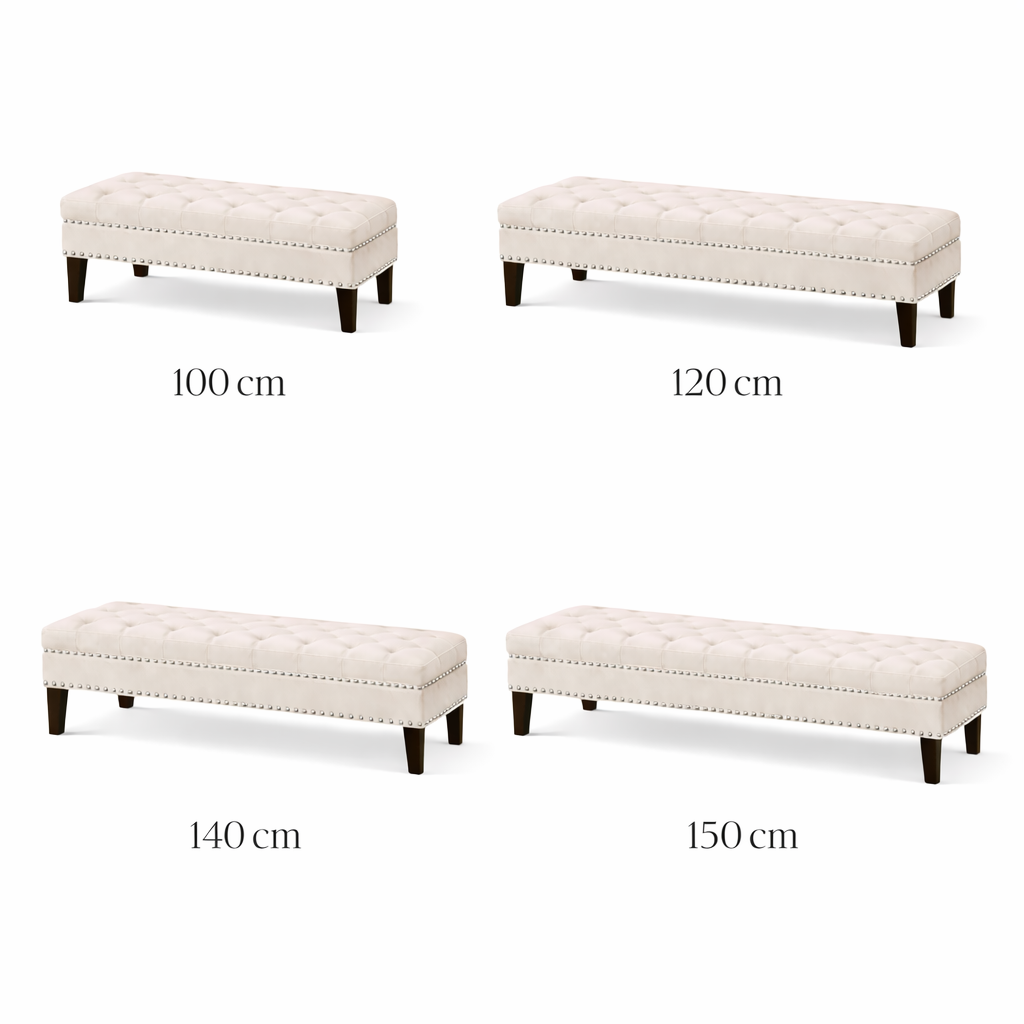 Ławeczka została obita pineskami w kolorze srebrnym ( możliwy dowolny kolor pinesek) oraz miękką, elegancką tkaniną welurową, która pięknie komponuje się z łóżkiem w tym samym wykończeniu. Istnieje możliwość personalizacji – możesz wybrać kolor tkaniny oraz rodzaj nóżek, aby stworzyć zestaw dopasowany do swojego wnętrza.