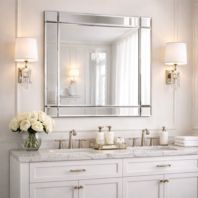 Wyjątkowe, prostokątne lustro w stylu Eichholtz, ręcznie wykonane w Polsce z najwyższą starannością i dbałością o detale. Oprawione w lustrzaną ramę o szerokości 10 cm, której boki ozdobione są eleganckimi, fazowanymi kwadratami 10x10 cm . Całość tworzy efektowną, ale subtelną kompozycję odbijającą światło i dodającą wnętrzu luksusowego charakteru.