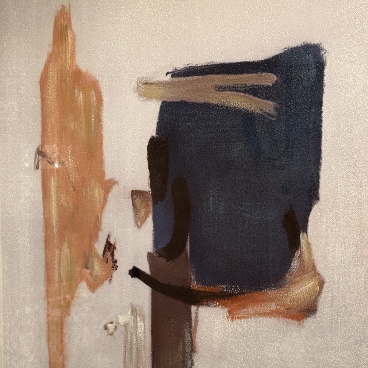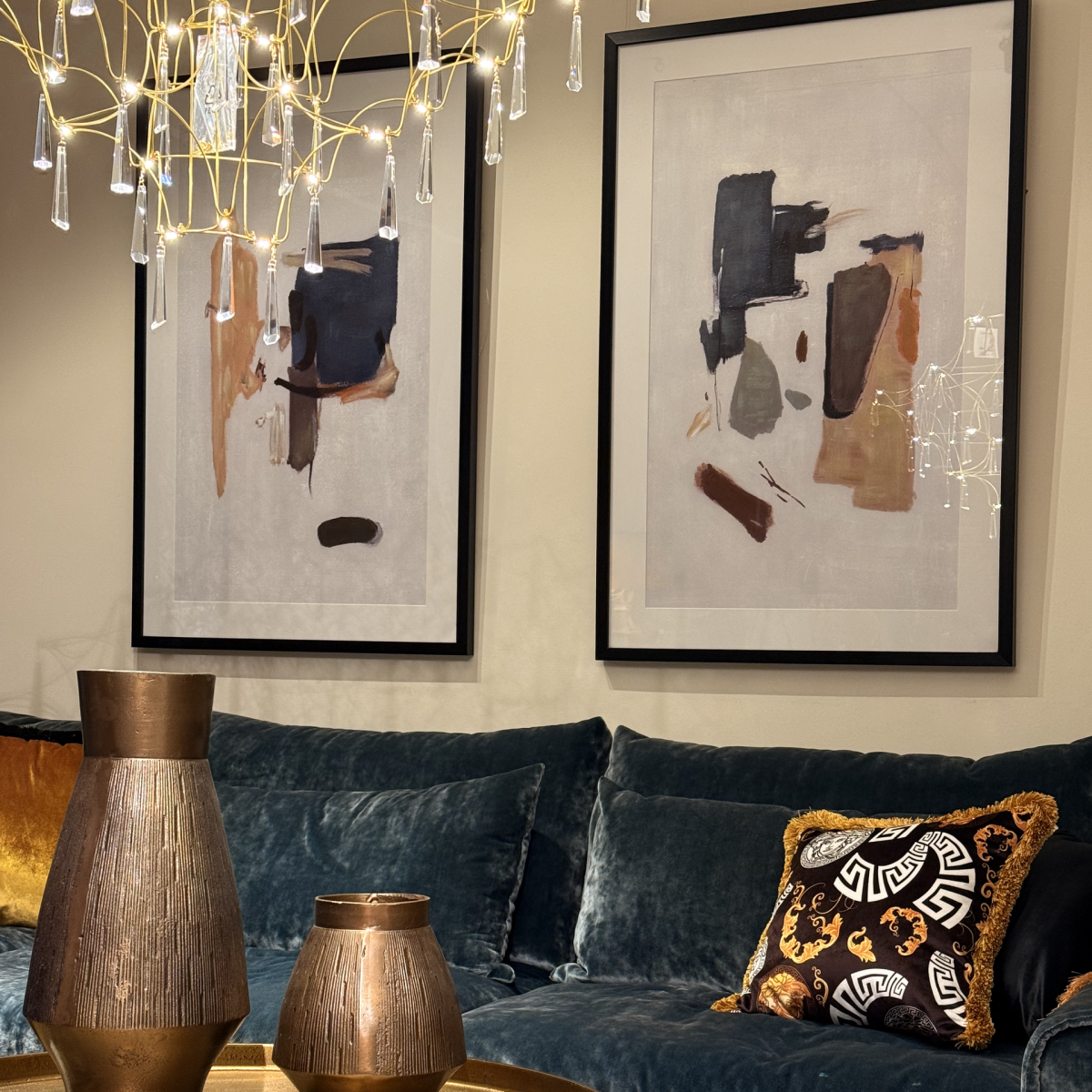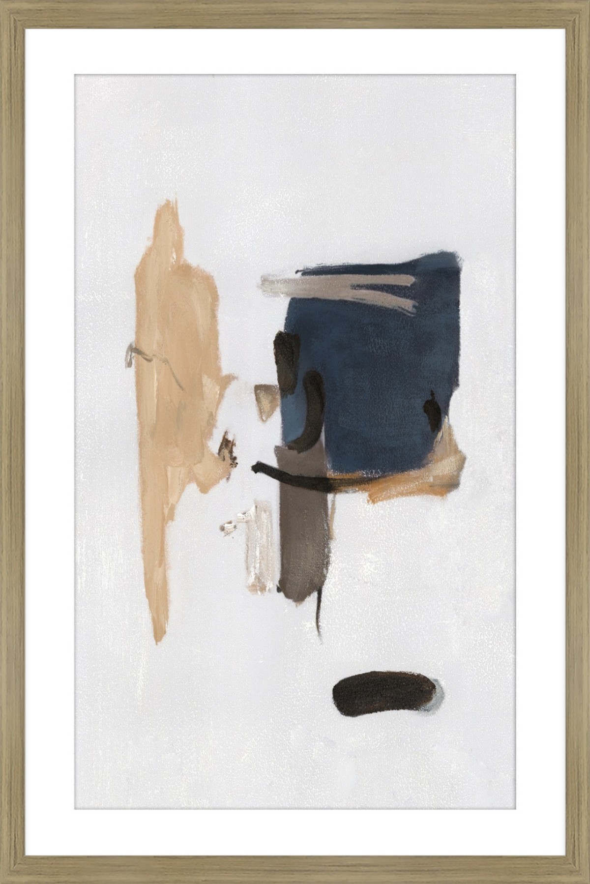 FJORD czerpie z krajobrazu północy — chłodne światło, ziemiste akcenty i pionowa harmonia. To nowoczesny obraz abstrakcyjny w rama w kolorze dębu (ciepły odcień drewna), z passe‑partout i szkłem. Dominujące kolory: taupe, brąz, granat, szarość. Siostrzana wersja o innym układzie plam — idealna do ekspozycji w duecie nad konsolą lub łóżkiem.