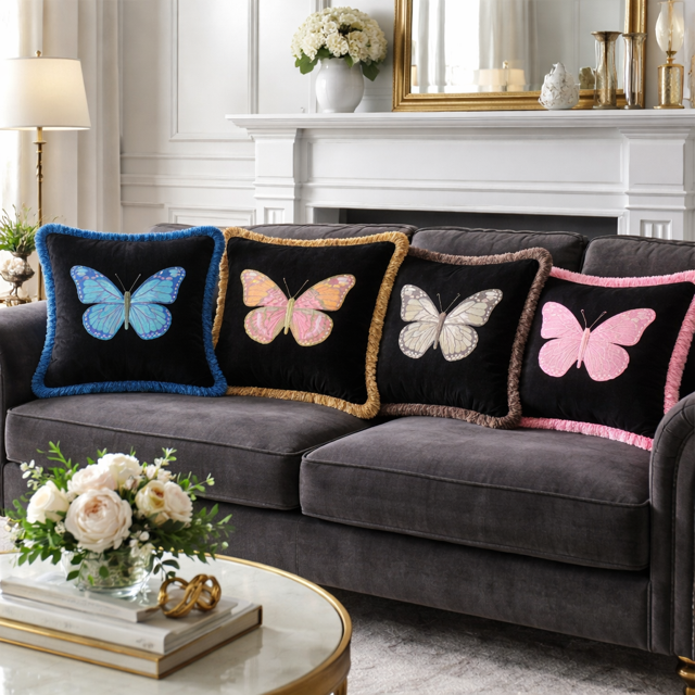 Wyjątkowa poduszka dekoracyjna wykonana z miękkiego, szlachetnego weluru, zachwyca oryginalnym wzorem kolorowego motyla w tropikalnym stylu. To propozycja dla osób, które cenią niebanalne dodatki i chcą wprowadzić do wnętrza odrobinę egzotyki oraz artystycznego charakteru.