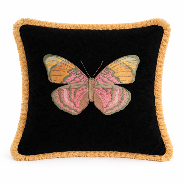 Poduszka dekoracyjna z motywem żółtego tropikalnego motyla na czarnym tle