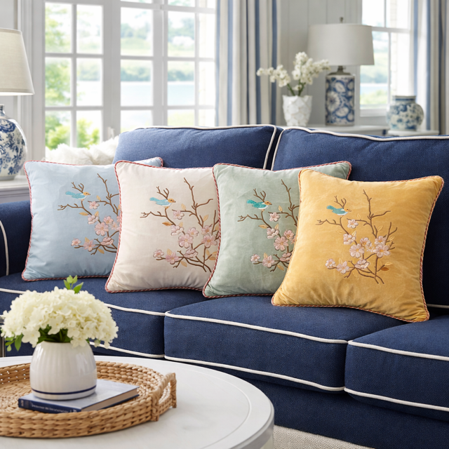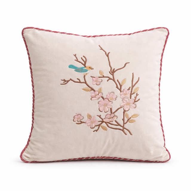 Kremowa poduszka welurowa z wyjątkowym, kolorowym haftem przedstawiającym gałązkę kwitnącej wiśni japońskiej w odcieniach różu, na której subtelnie przysiadł barwny ptaszek. Ten dekoracyjny motyw nadaje całości lekkości, elegancji i artystycznego charakteru.