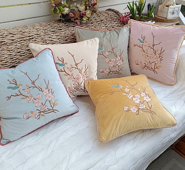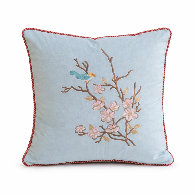 Pastelowo niebieska poduszka welurowa z wyjątkowym, kolorowym haftem przedstawiającym gałązkę kwitnącej wiśni japońskiej w odcieniach różu, na której subtelnie przysiadł barwny ptaszek. Ten dekoracyjny motyw nadaje całości lekkości, elegancji i artystycznego charakteru.