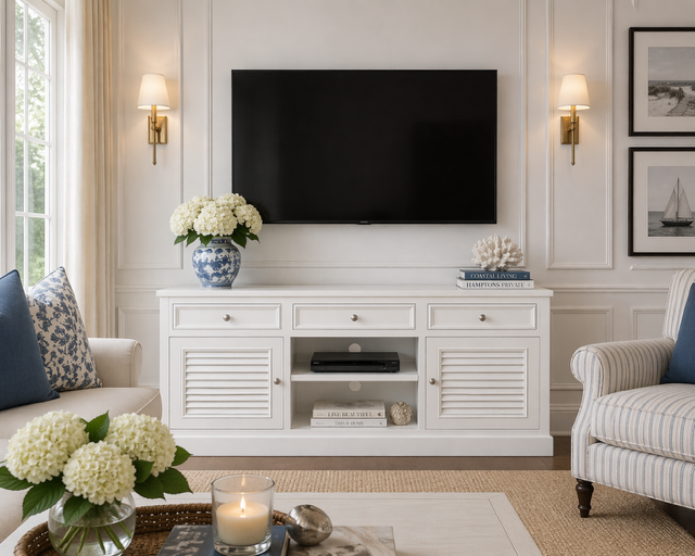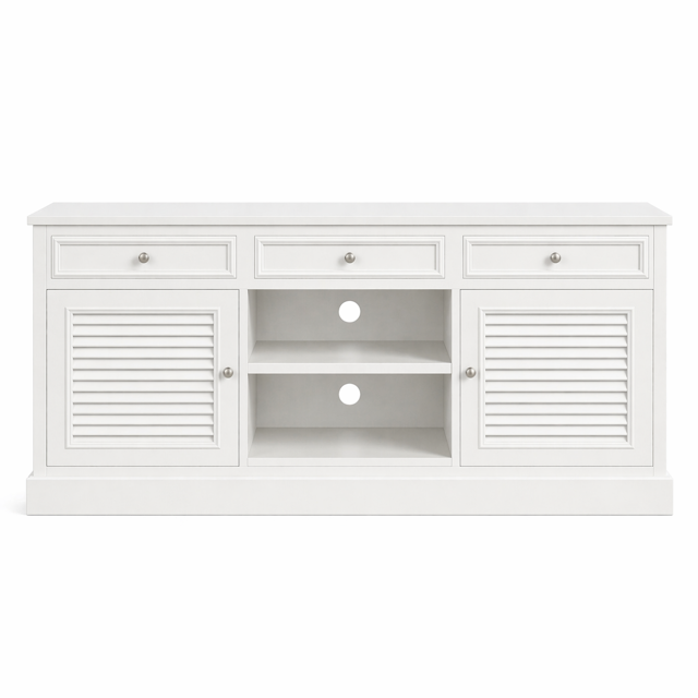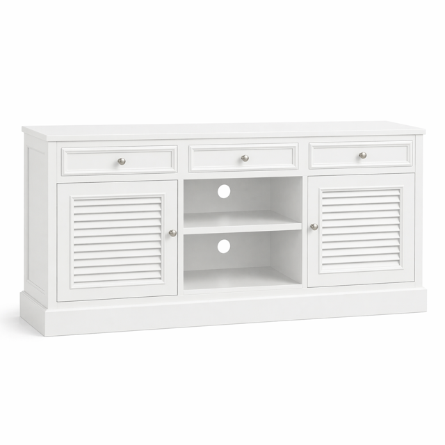 Oryginalna szafka rtv Hampton Long Island produkowana w Polsce, w kolorze białym matowym z szutersami w drzwiczkach, z szufladami na cichy domyk oraz z półkami na sprzęt oraz otworem z tyłu.