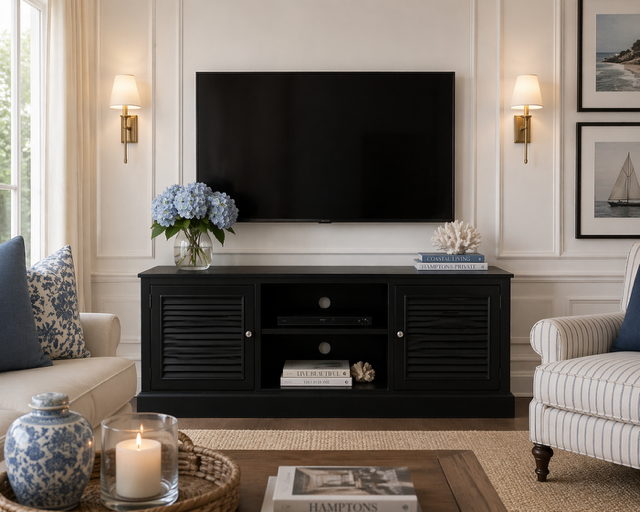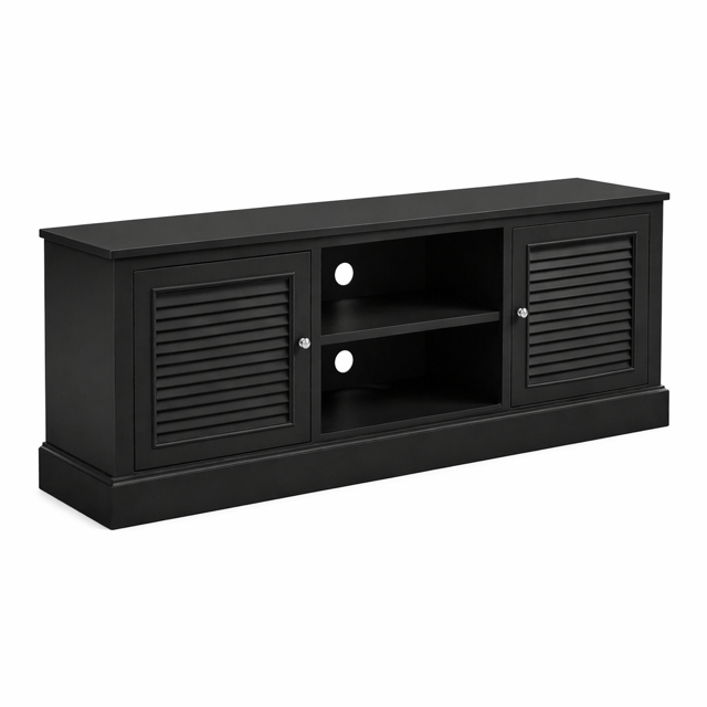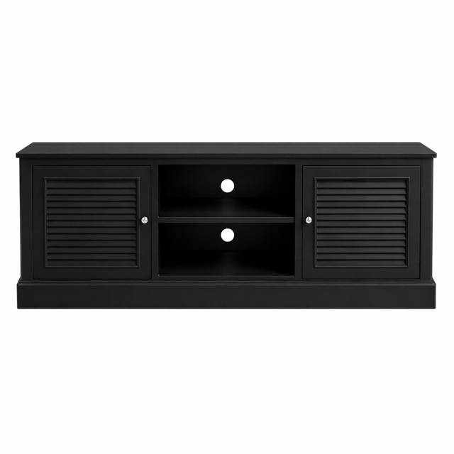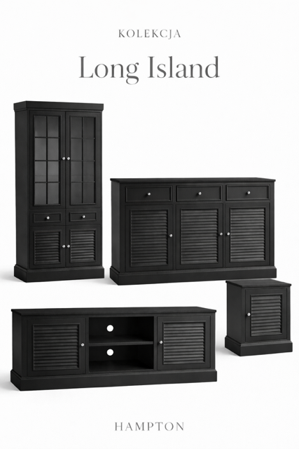 Oryginalna szafka rtv Hampton Long Island produkowana w Polsce, w kolorze czarnym matowym z szutersami w drzwiczkach oraz z półkami na sprzęt oraz otworem z tyłu.