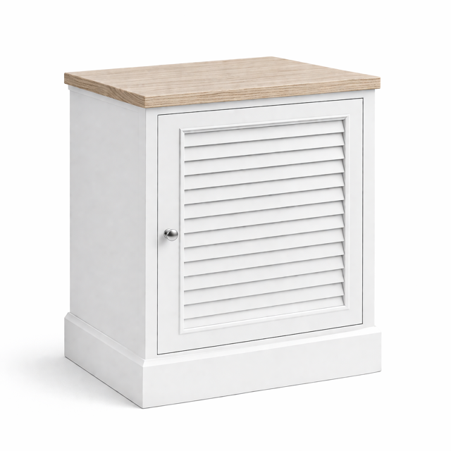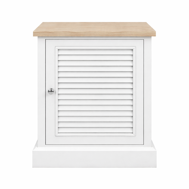 Szafeczka nocna drewniana z kolekcji Long Island Hampton z szutersami w drzwiczkach oraz blatem w kolorze dąb bielony.