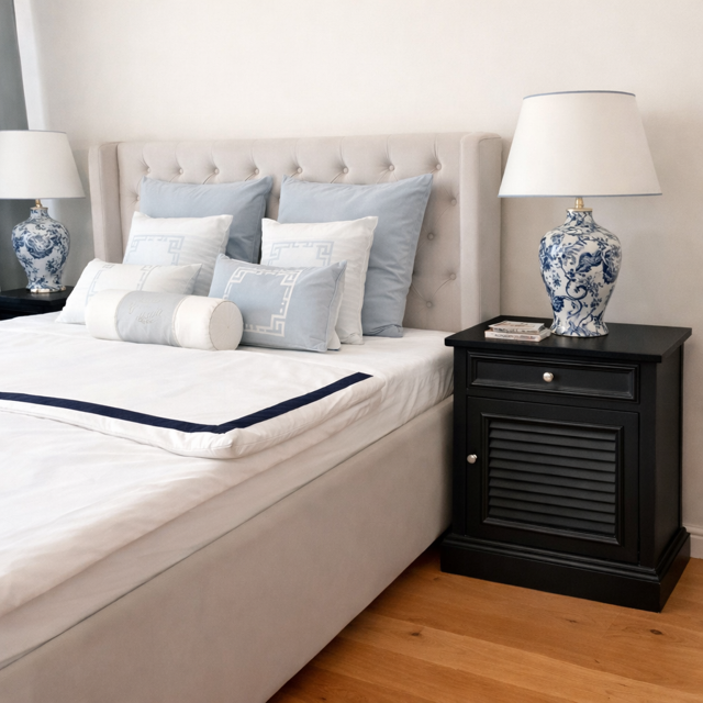 Szafeczka idealnie sprawdzi się przy łóżku kontynentalnym w sypialni w stylu hampton, modern classic.