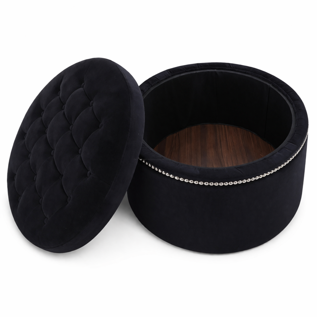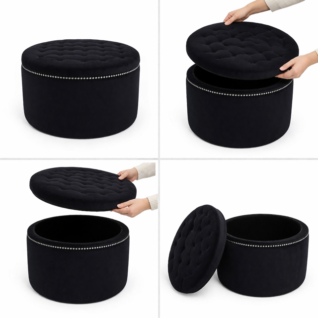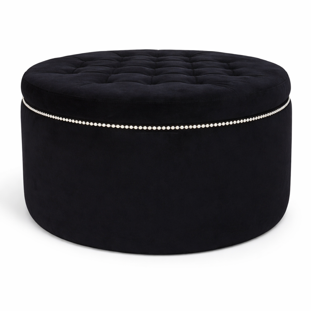 Model wyróżnia się efektownymi, głębokimi pikowaniami z guzikami oraz dekoracyjnymi srebrnymi nitami, które podkreślają jego luksusowy charakter. Dodatkowym atutem jest praktyczny, pojemny schowek, dzięki któremu pufa świetnie sprawdzi się nie tylko jako wygodne siedzisko czy stolik kawowy, ale również jako miejsce do przechowywania torebek i innych drobiazgów.