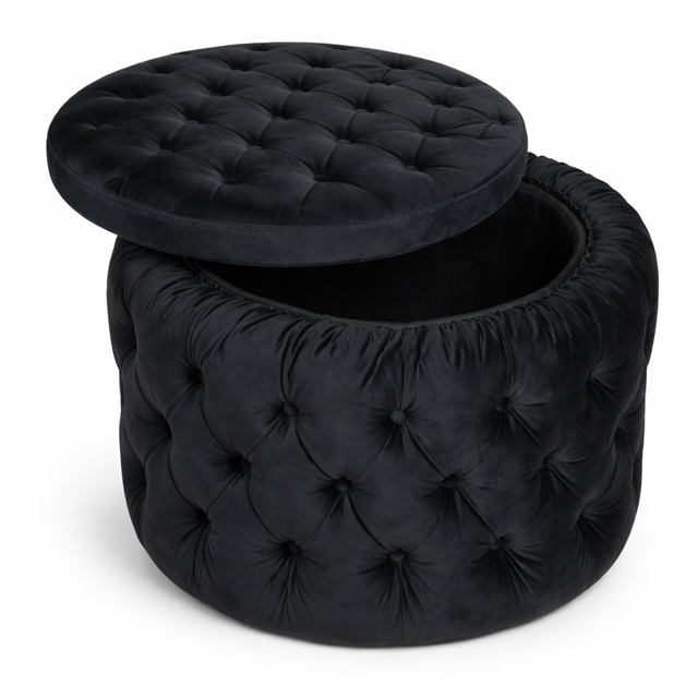 Stelaż wykonany z drewna bukowego, łączony tradycyjną techniką czopowania, zapewnia wyjątkową trwałość i stabilność mebla. Całość wykończona jest wysokiej jakości, grubą tkaniną welurową Sun Velvet w klasycznym czarnym kolorze, która nadaje pufie luksusowy charakter i przyjemność użytkowania.