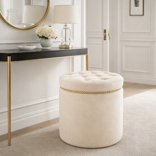Elegancka, ręcznie wykonana pufa okrągła pikowana to idealne połączenie funkcjonalności i wyjątkowego designu. Tworzona w polskiej manufakturze z najwyższej jakości materiałów, doskonale wpisuje się w styl modern glam, dodając wnętrzu subtelnej elegancji.